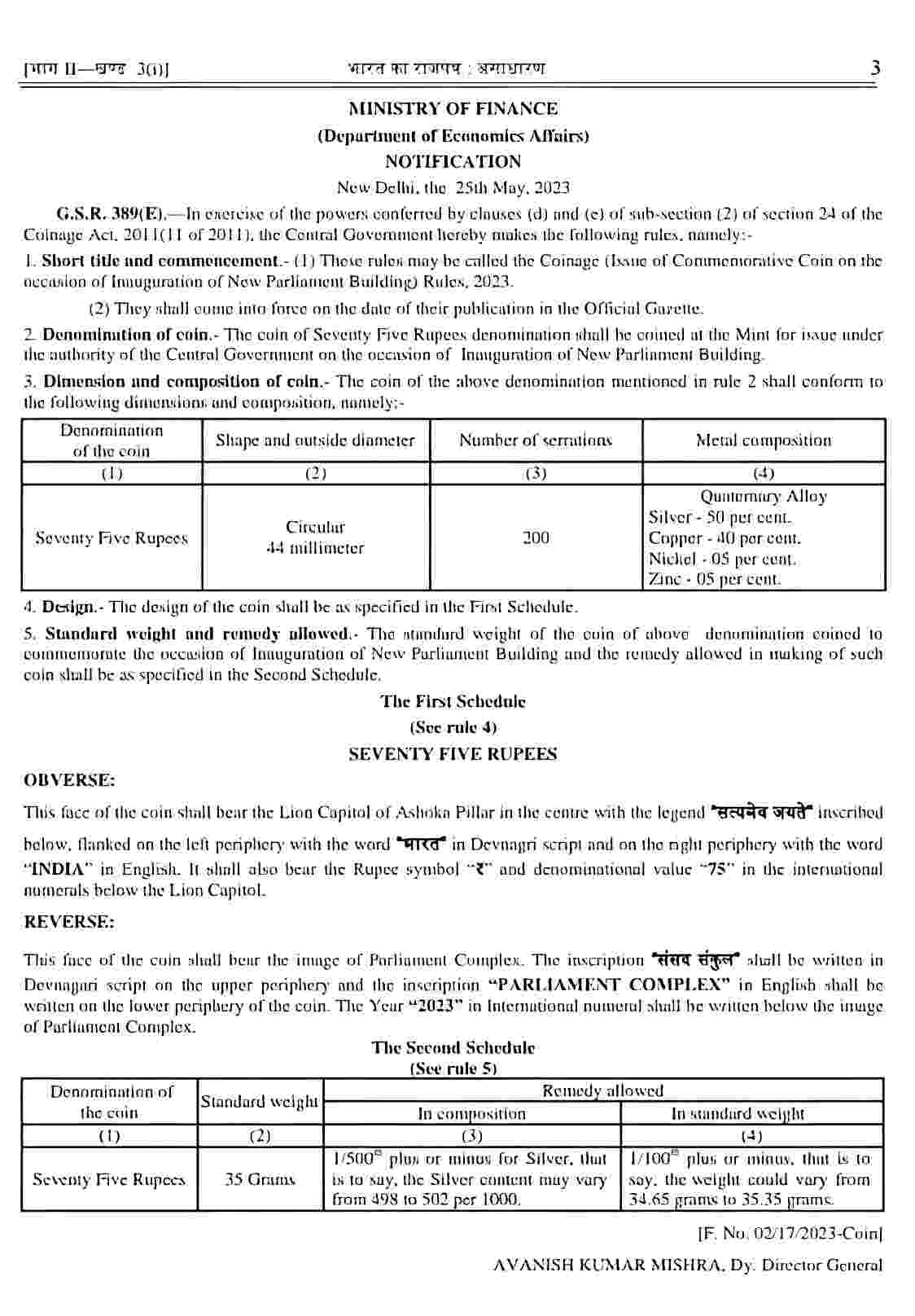 Ministry of Finance to launch a special Rs 75 coin to commemorate the inauguration of the new Parliament building on 28th May. pic.twitter.com/NWnj3NFGai