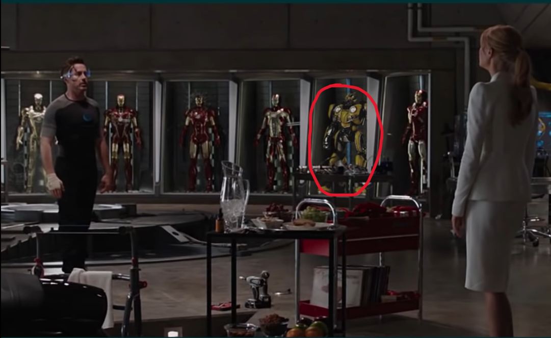 Look where Tony Stark is standing. He is standing near his collection of Iron Man suits, each better than the last with the latest technological modifications.