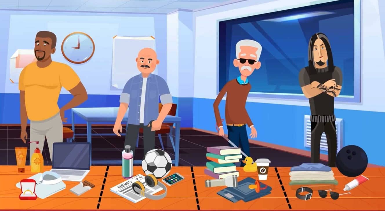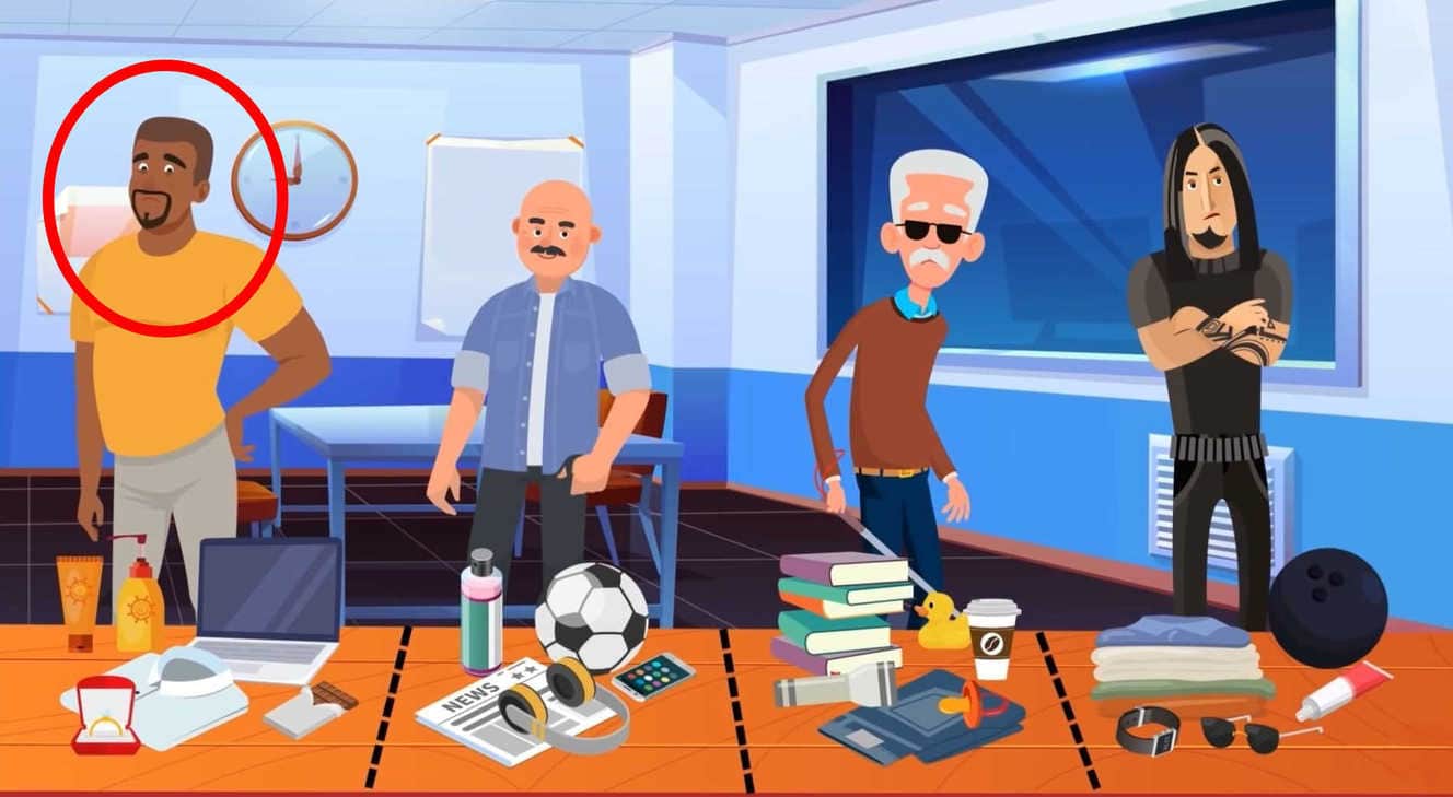 If you study the individuals and the items in their possession carefully, you can see that a bald person is carrying a shampoo bottle, for which he has no requirement.