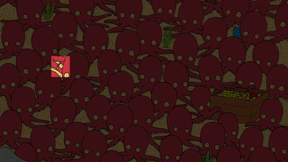 The image shows an image of a non-uniformly divided consortium of red octopuses. And your task is to find the fish hidden in the picture. Now divide the image into sections, go through all of them to not miss any clues and use your skills like logical reasoning, observational power, and other abilities to conclude this mental exercise.