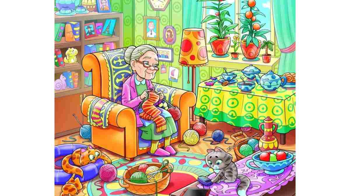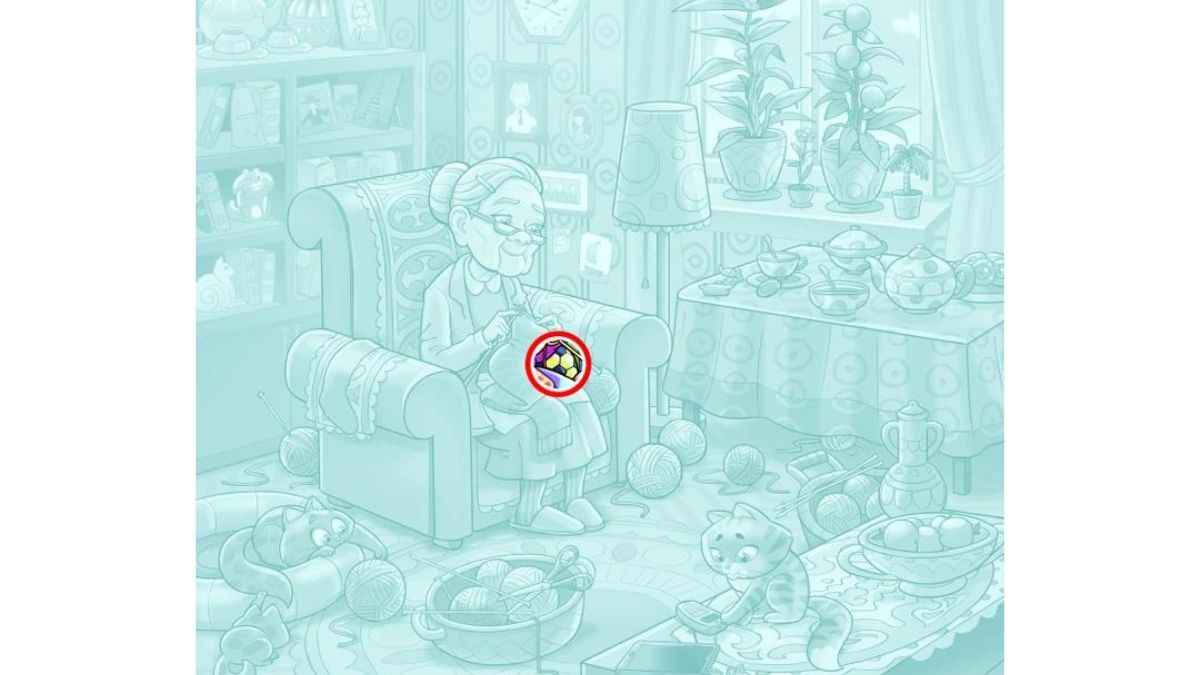The image shows Grandma sitting in the middle of the living room with her cats. Your task is to find the ball in the mess. Now, divide the image into sections and use your skills like logical reasoning, observational power, and other abilities to not miss any clues.