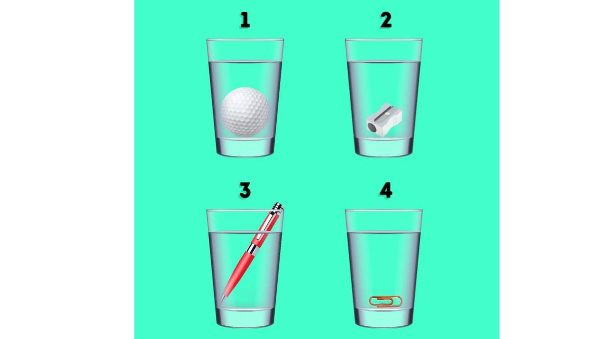 The image shows four glasses of water with different objects in them. And your task is to find the glass with the most amount of water. Now divide the image into sections, go through all corners to not miss any clues and put all your skills like logical reasoning, observational power, and other abilities to reach your goal.