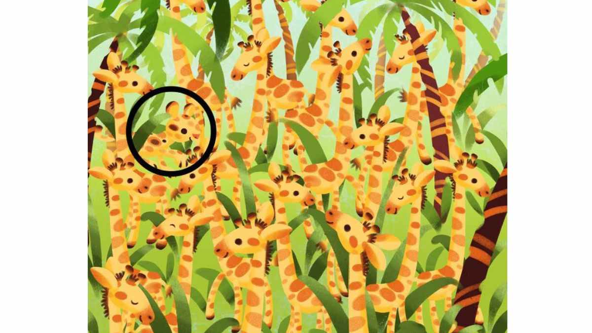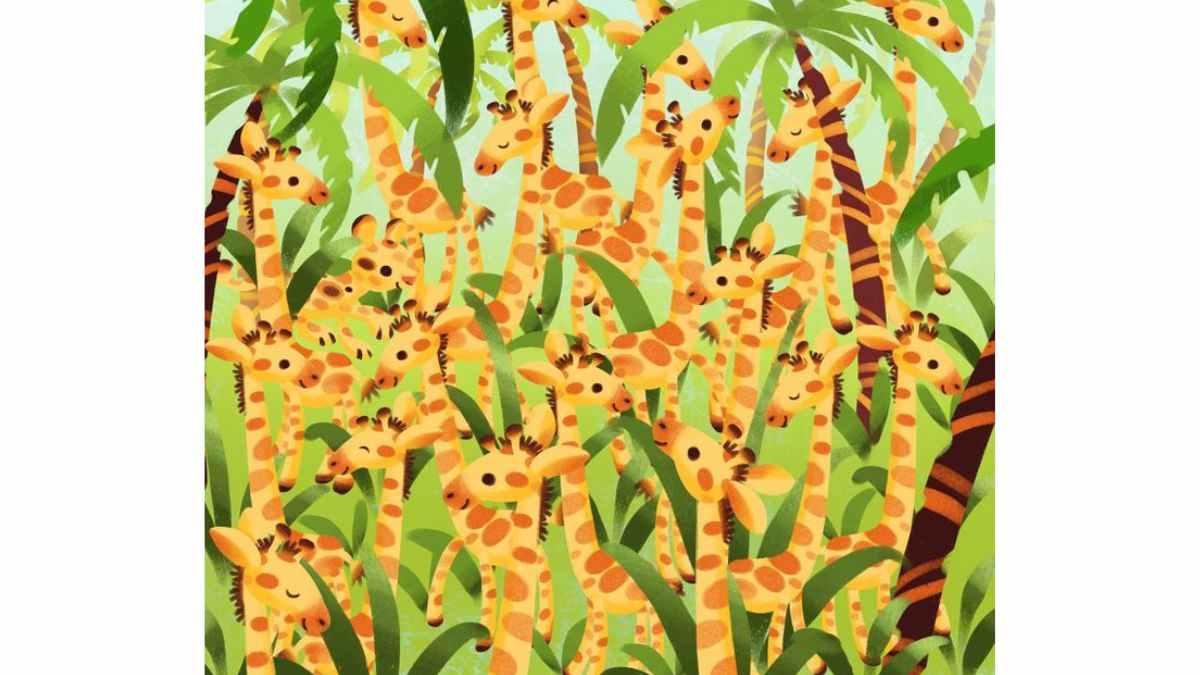 The image shows a group of non-uniformly divided giraffes. And your task is to find the leopard hidden in the picture. Now divide the image into sections, go through all corners to not miss any clues and use your skills like logical reasoning, observational power, and other abilities to reach your goal.