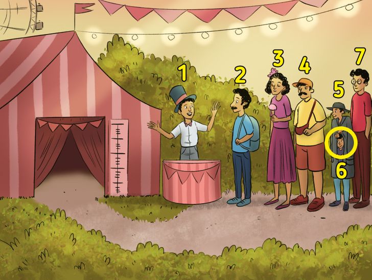 If you look at the queue in the image carefully, you will be able to identify the total number of people. So, let’s count the number of people - 4 men including the host, a lady, and 2 kids. The two kids have merged into one to get entry inside the circus. So, the answer to this mental quiz is that there are 7 people in the picture.