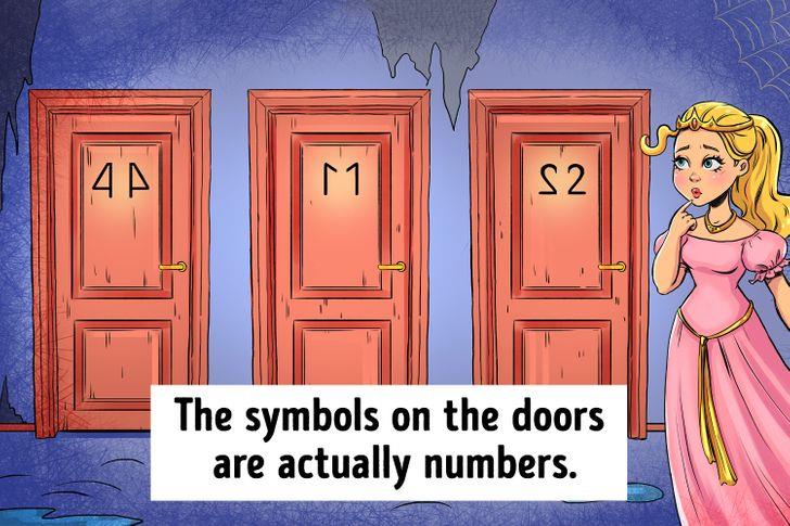 In the above image, you need to identify Door Number 4 through which the Princess can escape from the tower. The puzzle states that a princess got locked in a tower. She found out that she could escape through the fourth door. But there are only 3 doors. How can she find door number 4? You need to find Door Number 4 among the three doors.