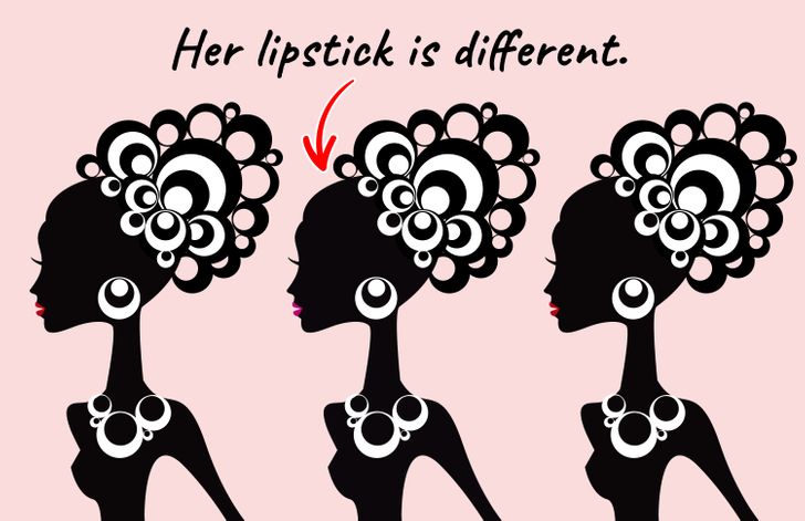 If you look at all three girls carefully, you will find that there is a very slight difference in one of the girls. All three girls have features of the same size and shape. However, if you see the girl at the center, you will see that the color of her lipstick is different from the others.