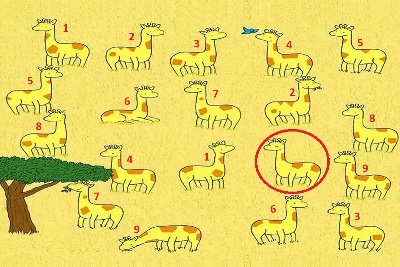 You can see in the above image that there are 9 pairs of Identical Giraffes in the forest. Only one (marked in a circle) doesn’t have its twin.