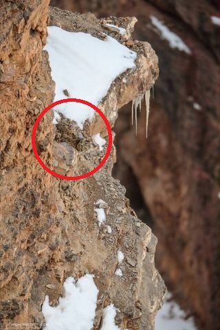This one is extremely tough to spot. We suggest zooming the image, and you will be able to notice Snow Leopard trying to get off the cliff.