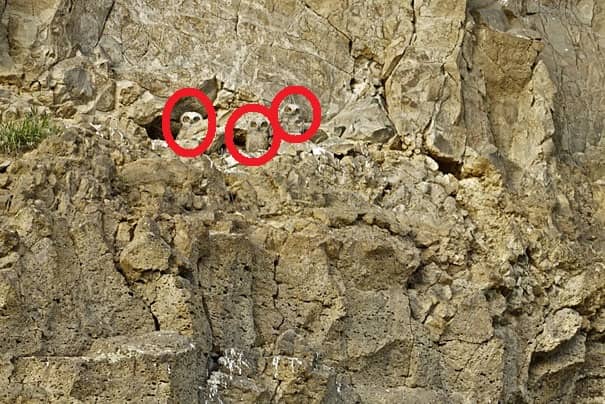 The three owls are sitting next to each other, while two owls are of the same colour as the rock and are sitting adjacent to each other, the third one has a white head and can be seen peeping curiously from the gap in the rock.