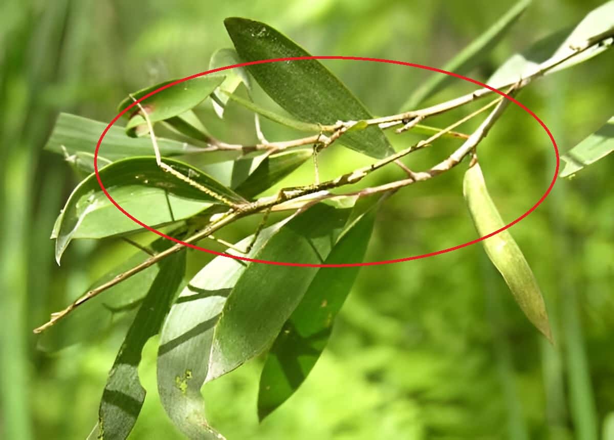 The insect that you were looking for is a stick insect, and its location is marked with a red circle in the image.