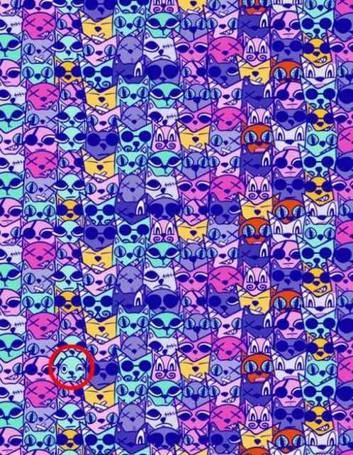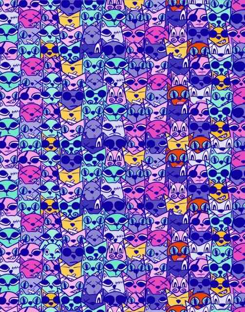 The image has a blue shade, all the cats in the image look like they are aliens and among them, a dog is hiding in plain sight.