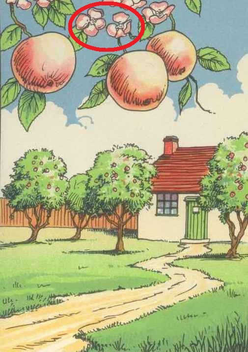 The mistake in the picture is that apple blossoms and fruit cannot exist in the tree at the same time.