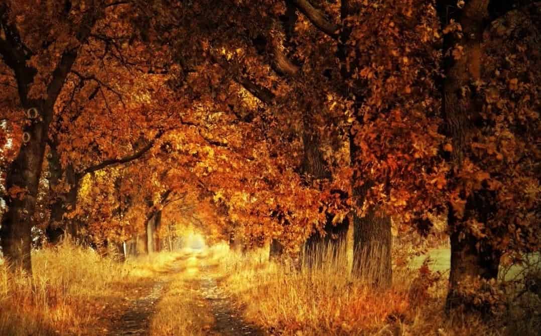The image shared above represents a forest scene and the golden orange leaves represent that it is autumn season.