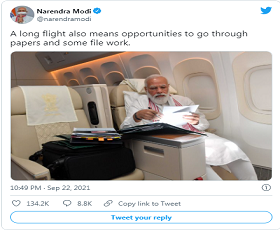 प्रधानमंत्री नरेंद्र मोदी ने बुधवार (22 सितम्बर, 2021) को अमेरिका के लिए अपनी "लंबी उड़ान" की एक झलक दी, जिसमें विमान के अंदर की एक तस्वीर पोस्ट की जहां वह कुछ जरूरी फाइलों को पढ़ रहे हैं.