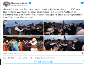 प्रधानमंत्री मोदी नए शामिल बोइंग 777 VVIP विमान जिसका कॉल साइन एयर इंडिया वन है और भारतीय उच्च स्तरीय प्रतिनिधिमंडल के साथ बुधवार (22 सितम्बर, 2021) को सुबह 11 बजे के बाद नई दिल्ली से उड़ान भरी और भारतीय मानक समय पर 3.30 बजे वाशिंगटन, डीसी में संयुक्त बेस एंड्रयूज पर गुरुवार (23 सितम्बर, 2021) को उतरे.