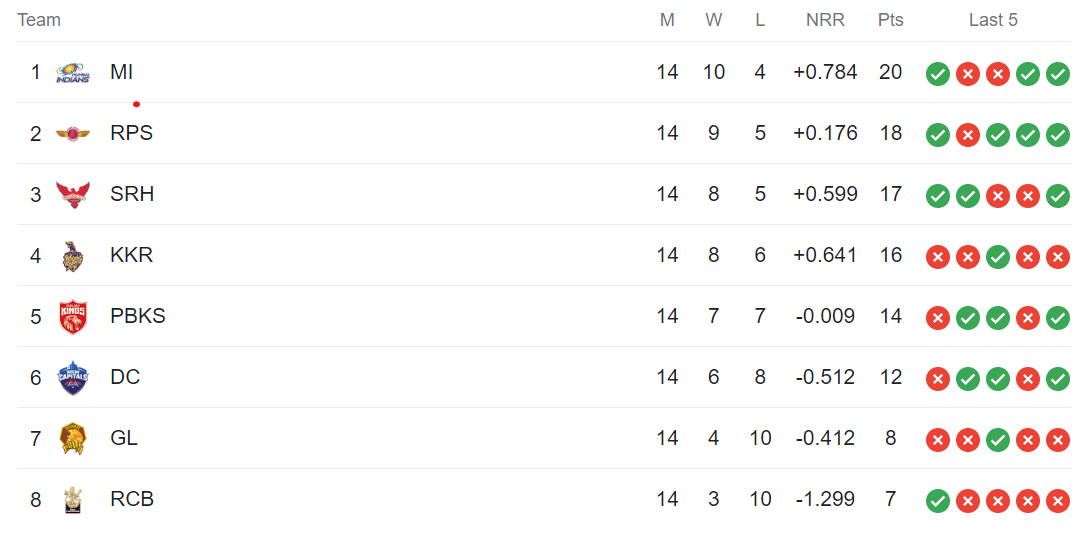 | 4 | Mumbai Indians (Q) | 14 | 8 | 6 | 0 | 0 | 16 | -0.044 |