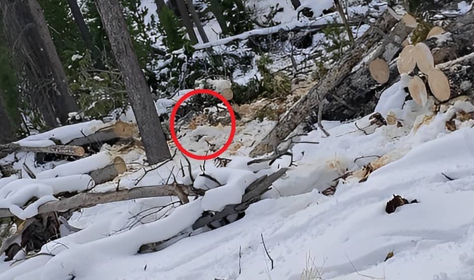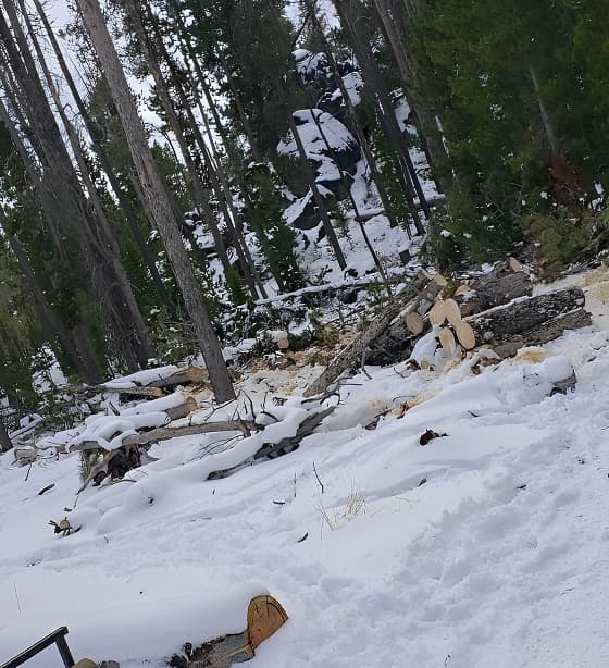 The image shared above shows a forest scene in which you can see logs of wood kept, and the snow suggests that it is winter season.