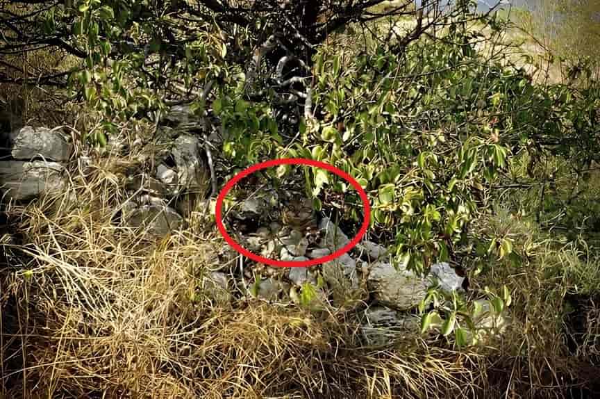 The cat can be seen resting in the block of stones right under the branch filled with leaves. The position of the cat is highlighted with a red circle.