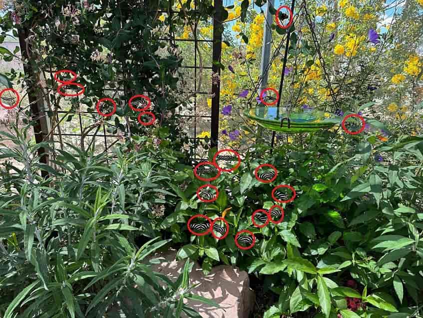 The butterflies are beautiful with black and white patterns, you can find all 19 of them marked below in the image.