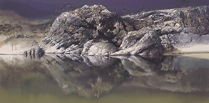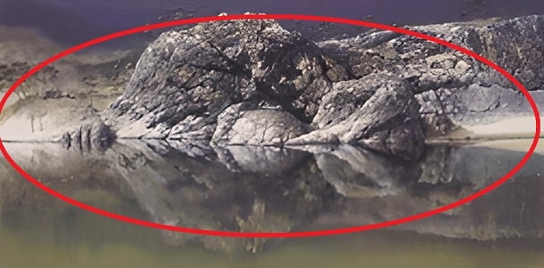 This image is a natural illusion where the shape of a mountain is reflected in the water body, forming the structure of a woman and child.