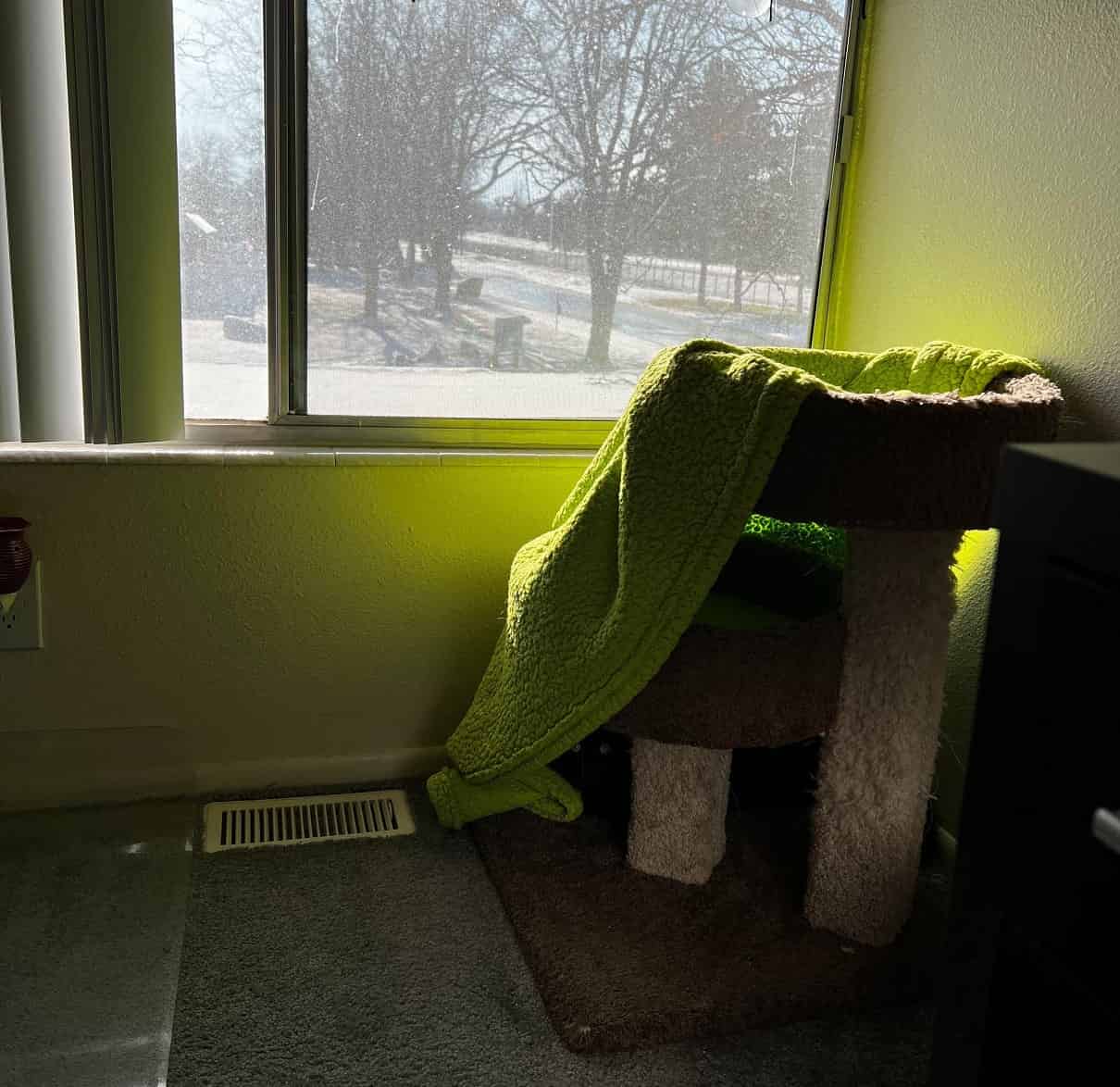 In the image shared above, you can see a room scene with a snow covered road outside. There is a cat hiding somewhere in this image, you need to find it in 10 seconds.