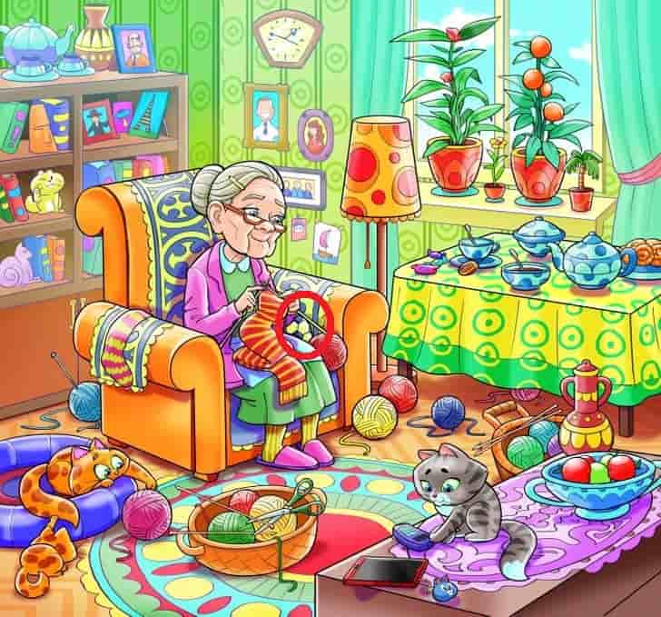 The image shared above depicts a room scene where you can also see an elderly lady knitting sweaters and her cats in the room.