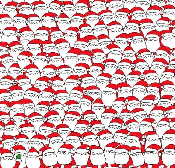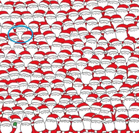 The sheep is hiding expertly among the sea of Santas in the image. The challenge for you is to find the hidden sheep in 10 seconds.