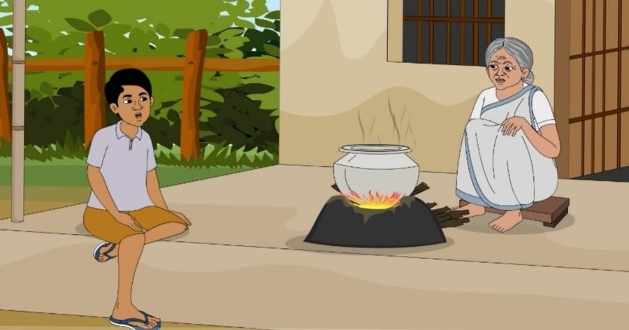 The image shows a village scene in which an old lady can be seen along with a boy.