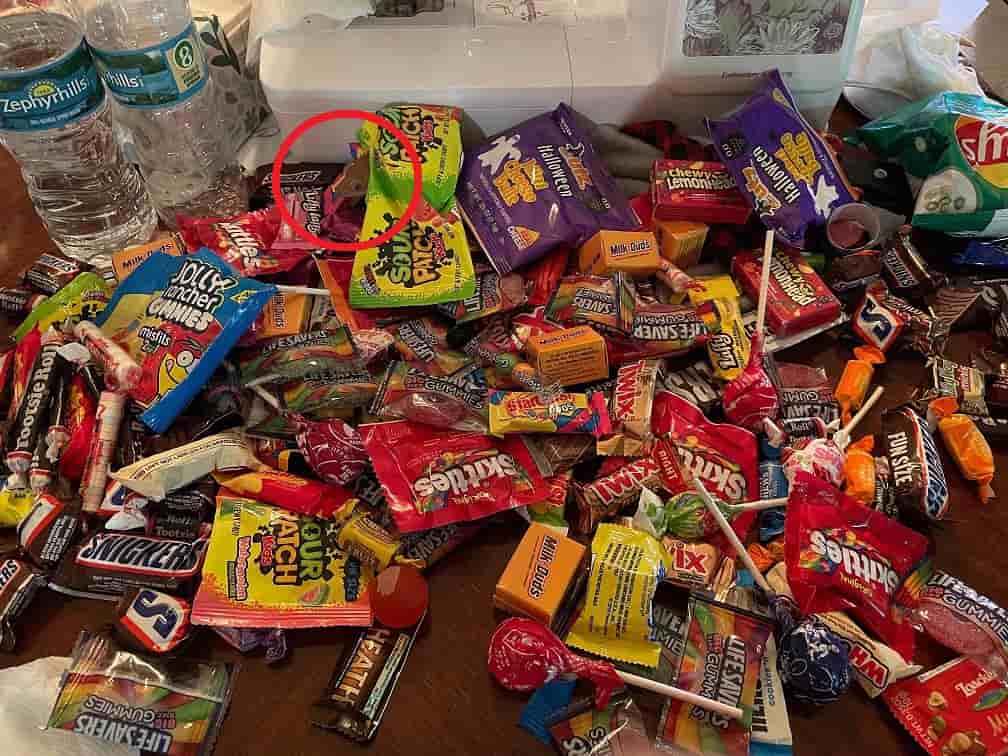 You can see the gecko hiding under a packet of Sour patch, peeping its head out.