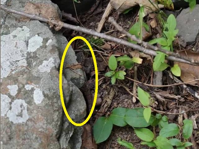 The lizard can be spotted on the left side of the image; it is a grayish-colored lizard that is hiding under the stone.