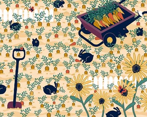 The picture of the farm here shows sunflowers, wheelbarrows carrying carrots and a few rabbits that are feasting on the ones that are still in the ground.