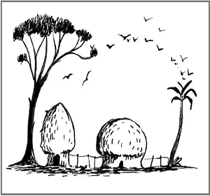 A village with huts, trees, and birds, or an elephant?