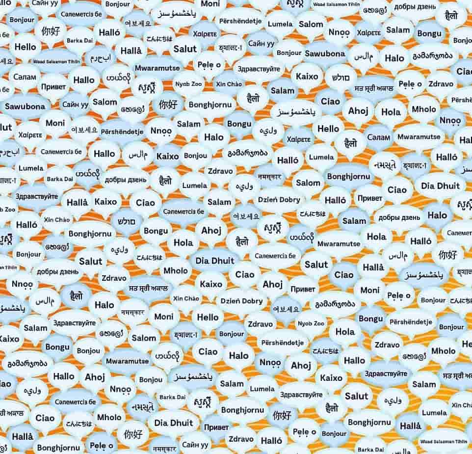 We can see the familiar expressions of Hola, Bonjour, Salut, Ciao etc which are spread all over the image.