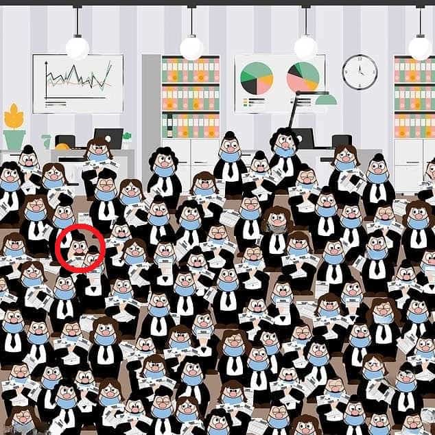 All except one among them is not wearing a face mask and your task is to spot the man without a face mask in 6 seconds.