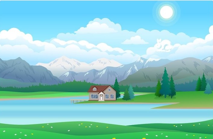 In the image, you can see a river and mountains scene. Also, some pine trees and a lovely little cottage can be seen.