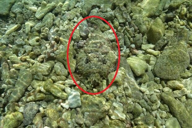 The fish in question is a stonefish, which is one of the most venomous fish in the world. It can be seen resting at the centre of the image.