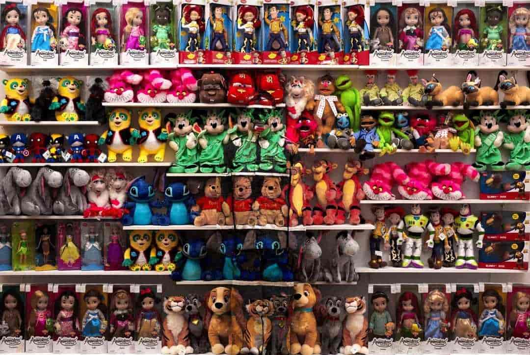 The above image depicts a toy store scene in which various stuffed toys can be seen arranged in racks.
