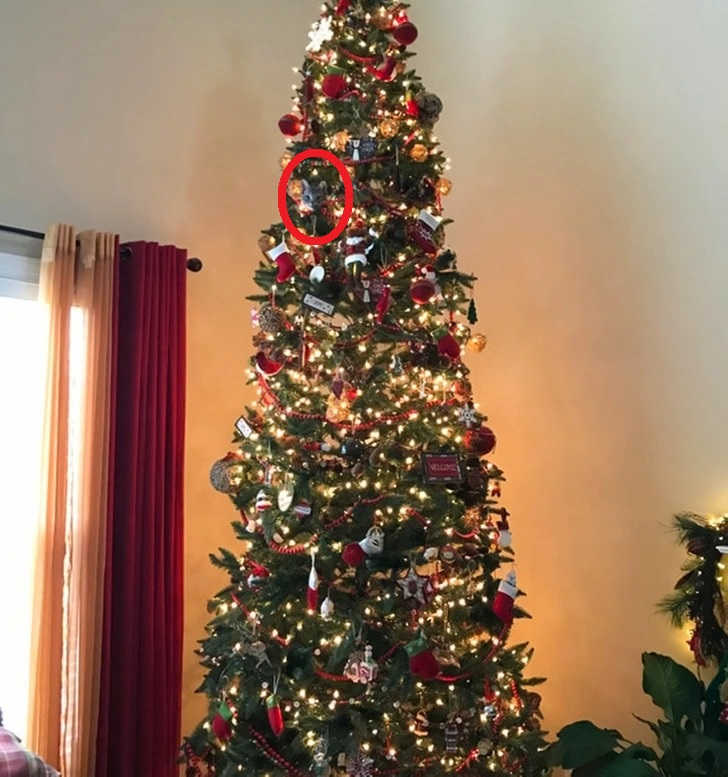 The cat can be seen on the left side of the image at the top of the Christmas tree, it is peeping from the branches.