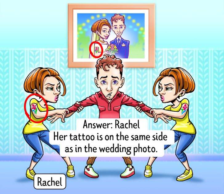 This puzzle asks you to find the lady who is the real wife of the man. If you look carefully at the wedding photo in the picture then you will be able to identify the real wife of the man. The two ladies, Rachel and Sarah, have identical features. However, if you look at the wedding photo, the man’s wife has a tattoo on her right hand. Rachel has the tattoo on the same side as in the wedding photo.