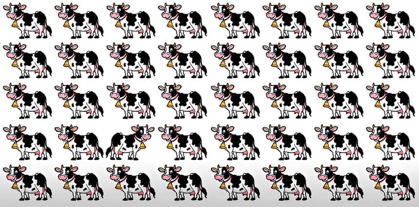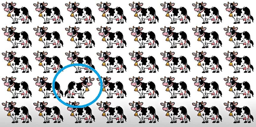Finding the odd cow among similar-looking cows is a difficult task, and you must focus on the image to get the correct answer.