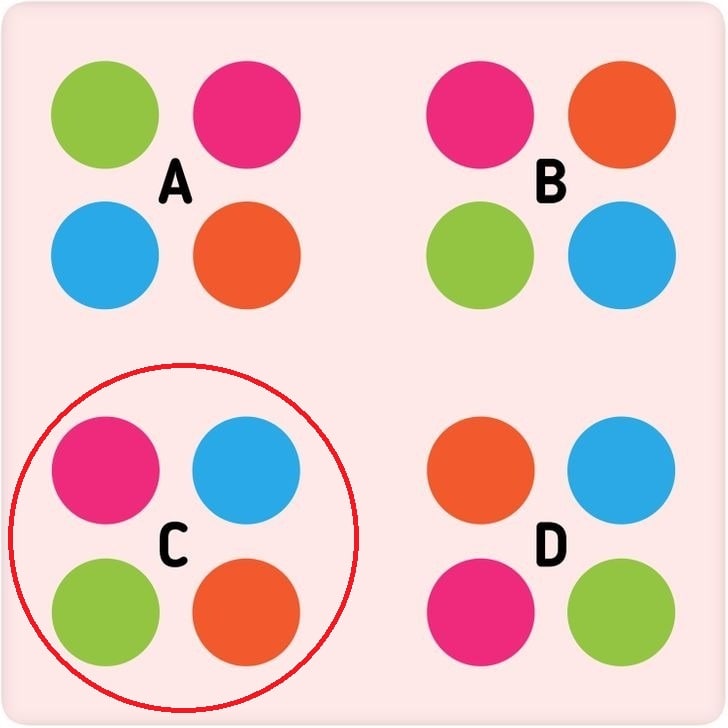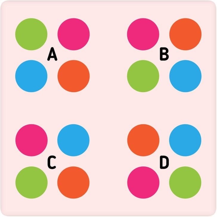 The image shared above depicts four shapes consisting of circles of four different colours. There is a single shape that is different from the others and you have 7 seconds to find out the odd one.