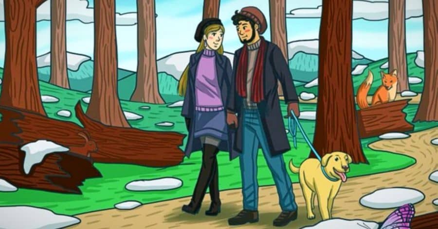The image shared above presents a jungle scene where a couple can be seen walking hand in hand, the dog is also walking with them.