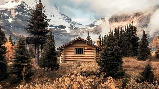 The image shared above depicts a forest scene in which you can see a cottage with trees around it.