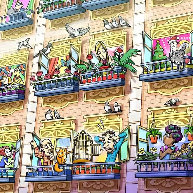 The image shows a balcony scene in a gated society where different types of people can be seen.