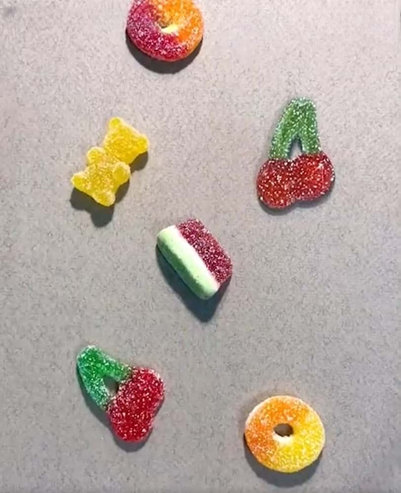 In the image shared above, you can see 6 sugar-coated candies on the screen out of which two are cherries, two doughnut-shaped candies, and one piece each of watermelon slice and bear.