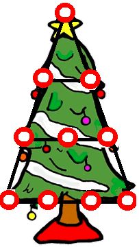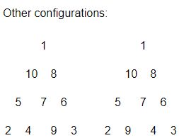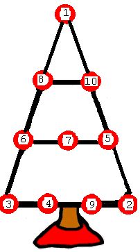 Place each of the numbers from 1 to 10 on the ornaments below so that every line adds up to the same number. There are five lines (there are three lines containing four ornaments, one line with three ornaments, and one line with just two ornaments).