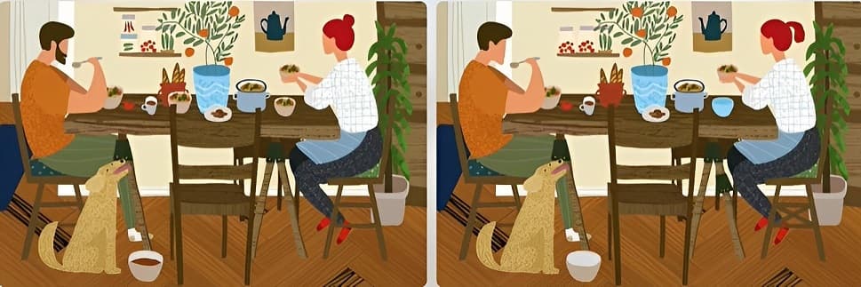 The image shown above depicts identical dining table scenes in which a family can be seen having dinner. There are 10 differences between the two images, and you have 53 seconds to find them.
