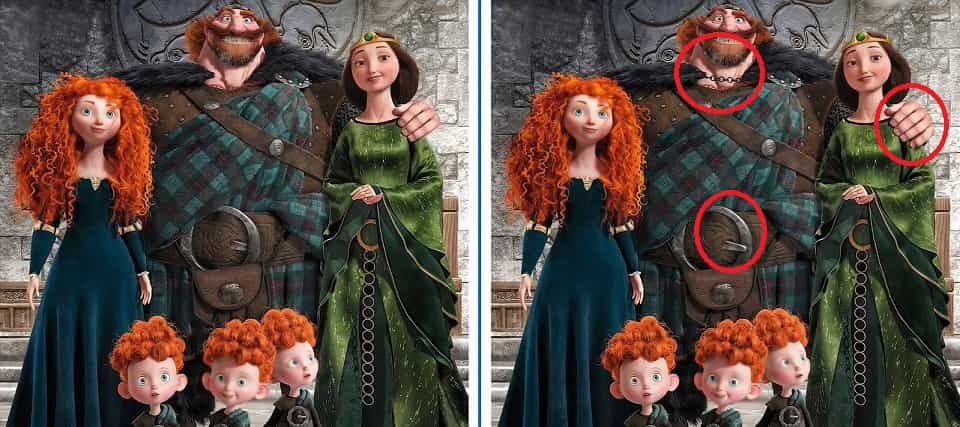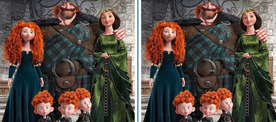 The two images shared above depict stills from Pixar’s animated movie Brave. In the two images, we can see Princess Merida with her father, mother and three identical triplet brothers.