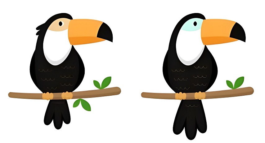 The image shown above depicts two toucans sitting on tree branches. There are 5 differences between the two images, and you have 10 seconds to find them.