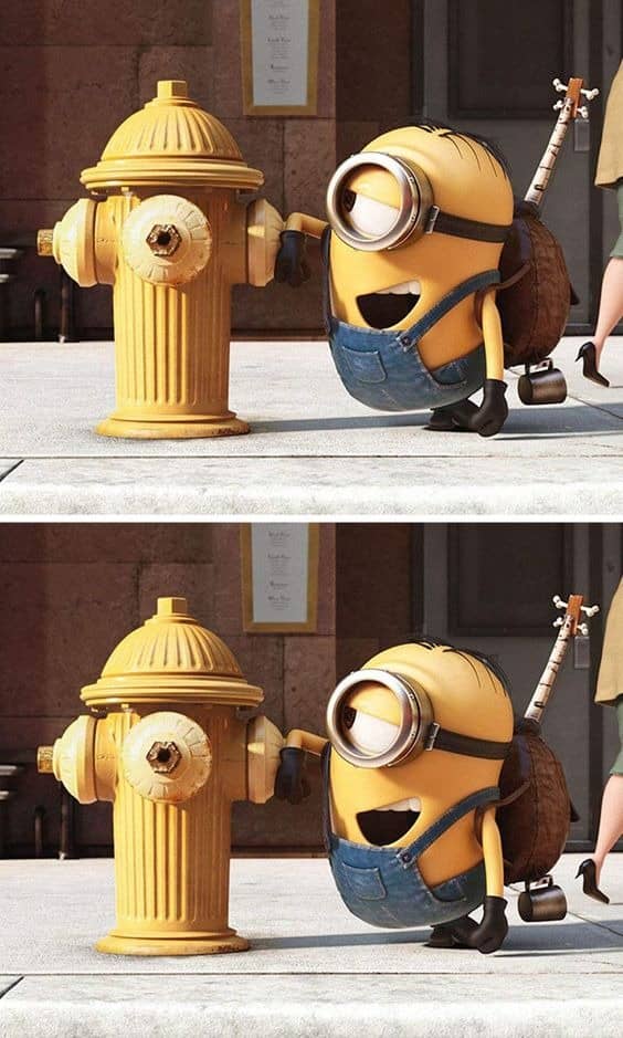 The above-shown image shows a minion from the movie Minions, in this image, you see that the minion character “Stuart" is standing near a fire hydrant.